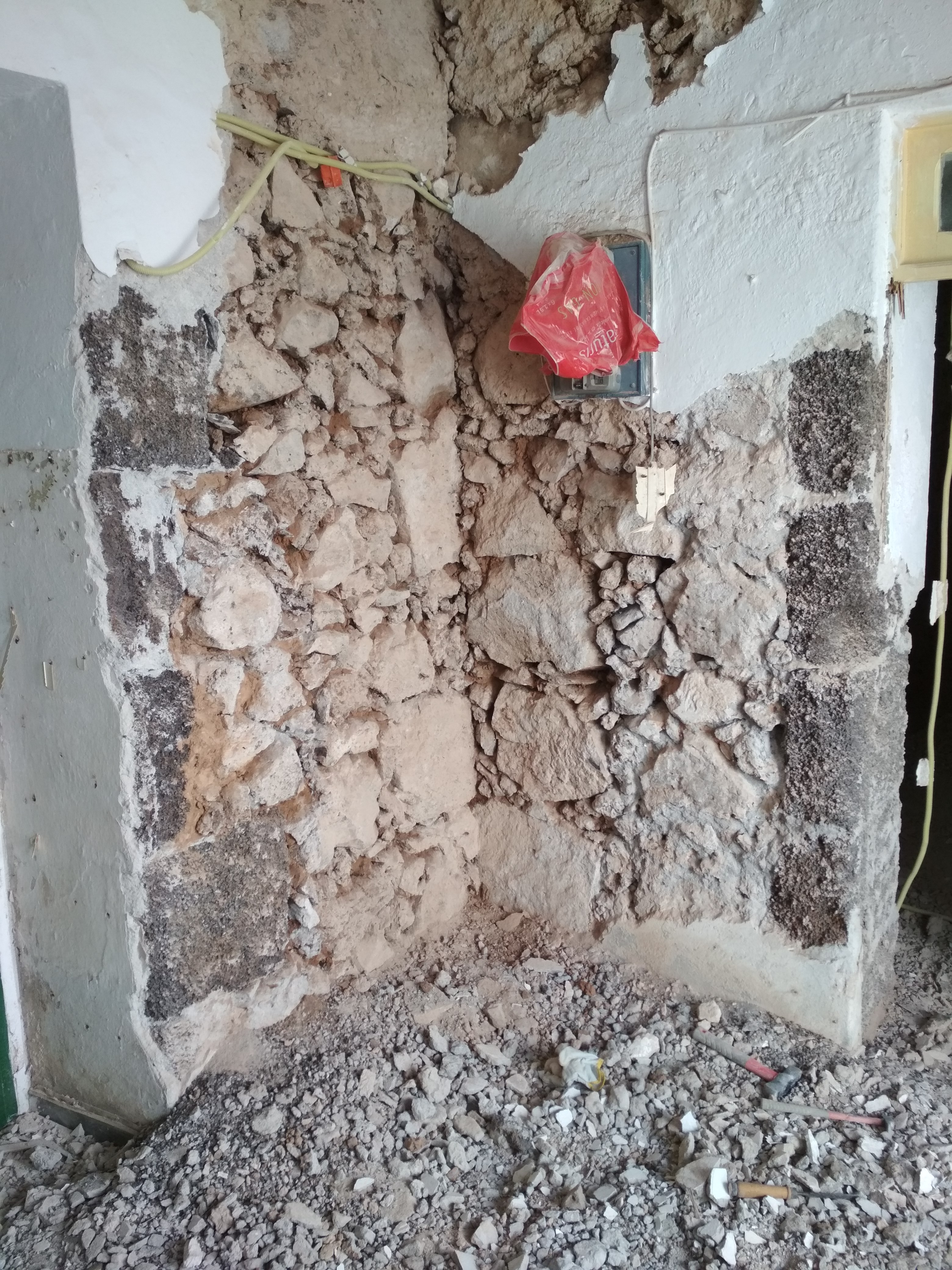 Auf dem letzten Foto kann man übrigens toll die sogenannten Cantos erkennen. Das sind Bausteine, die entweder aus bröseligem Lavagestein ausgeschnitten, oder aber aus Lavasteinchen zusammengebabbt wurden, so ganz weiß ich es nicht. Jedenfalls ist es ein Leichtes, die kaputtzuhauen, was gar nicht so gut ist. Leider sind es auch genau die Steine, die dick mit Zement verputzt sind. Eine Heidenarbeit, die davon zu befreien, ohne sie zu zerstören. Aber wir sind ja fleißig. Und liebevoll.