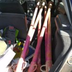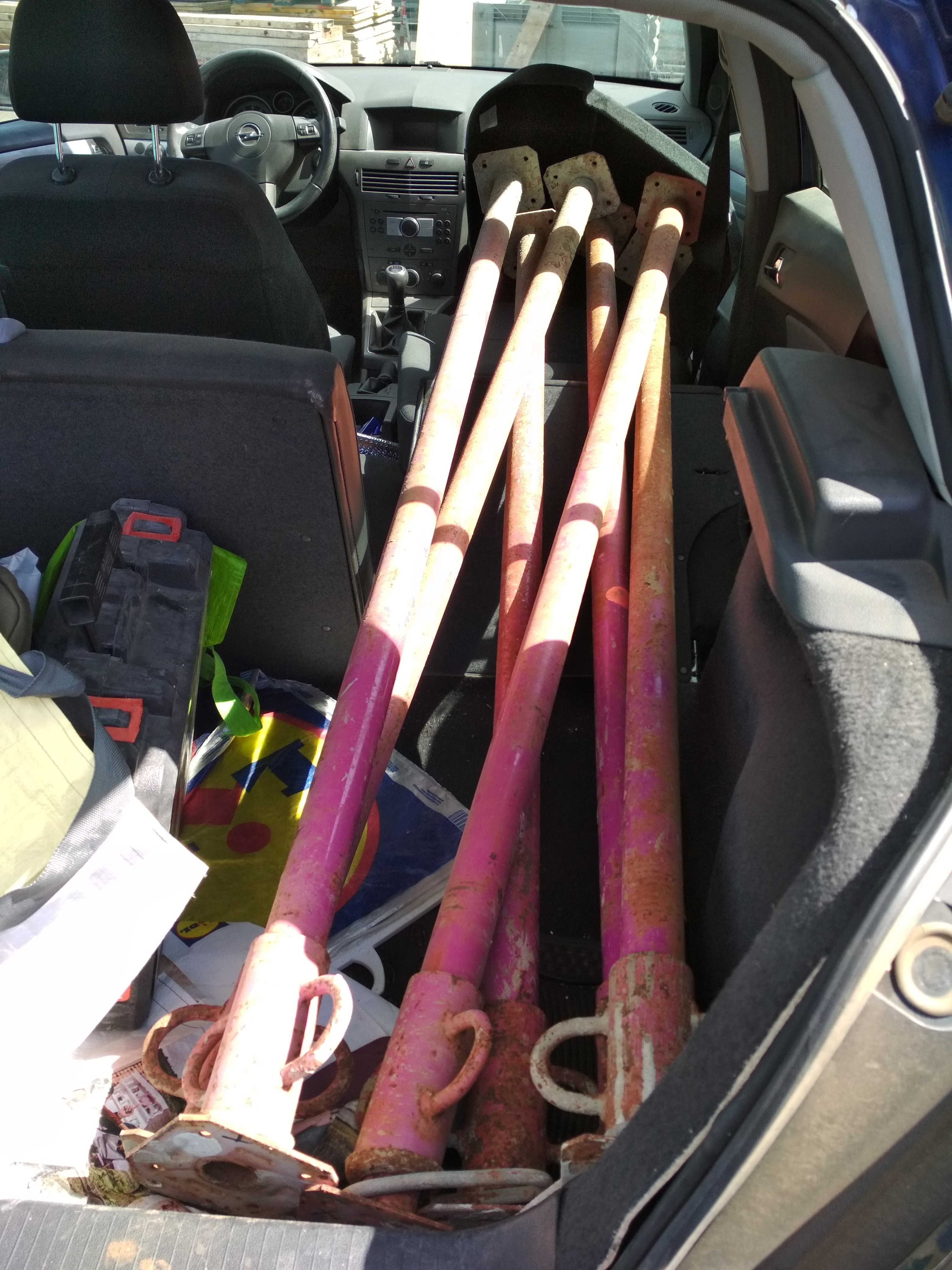 Und gleich heute Vormittag sind wir zum Baumarkt, um erst einmal einen ordentlichen Vorschlaghammer zu kaufen. Dann zu einem Maschinenverleih, dort liehen wir „puntales“ aus, diese metallenen Stützen, um eben die ungesicherten Türlöcher abzustützen. 6 Cent pro Stück pro Tag, hätte nie gedacht, dass das so billig ist, und dann auch noch in rosa, wie hübsch. Die also ins Auto, nachdem Beifahrer- und rechter hinterer Sitz umgeklappt worden waren, ich nahm links hinter Ollie Platz, und ab ging’s nach Mala.