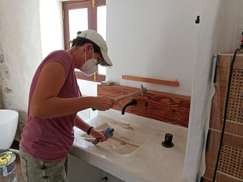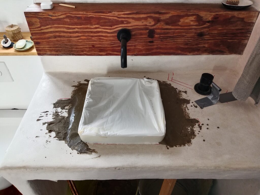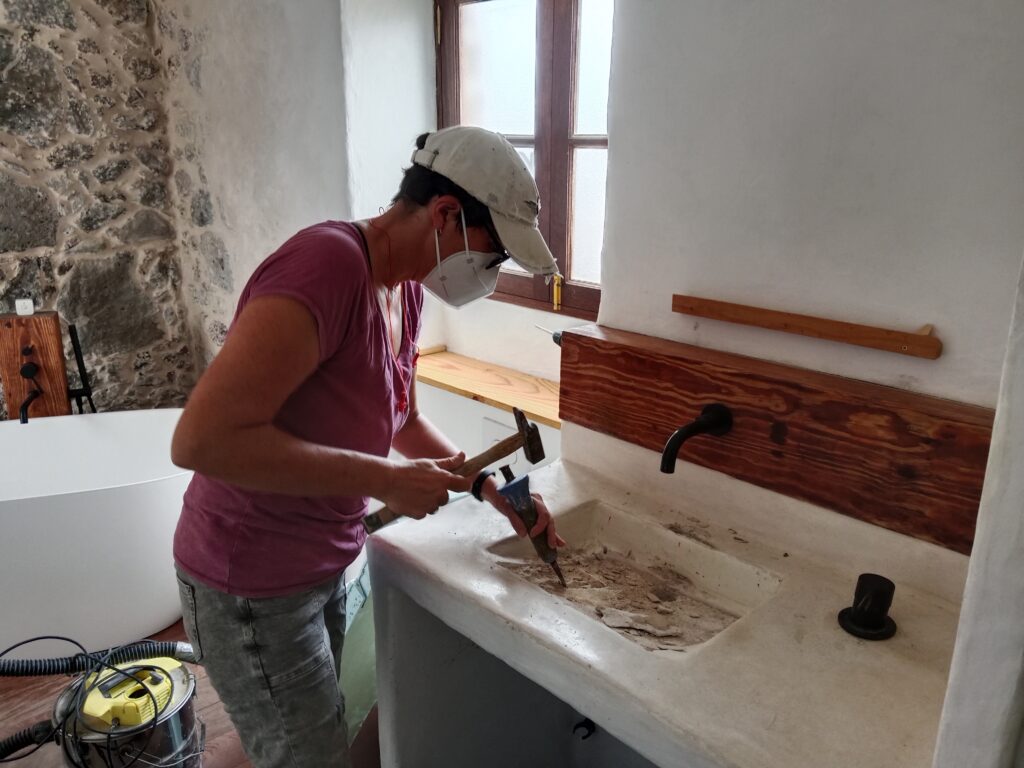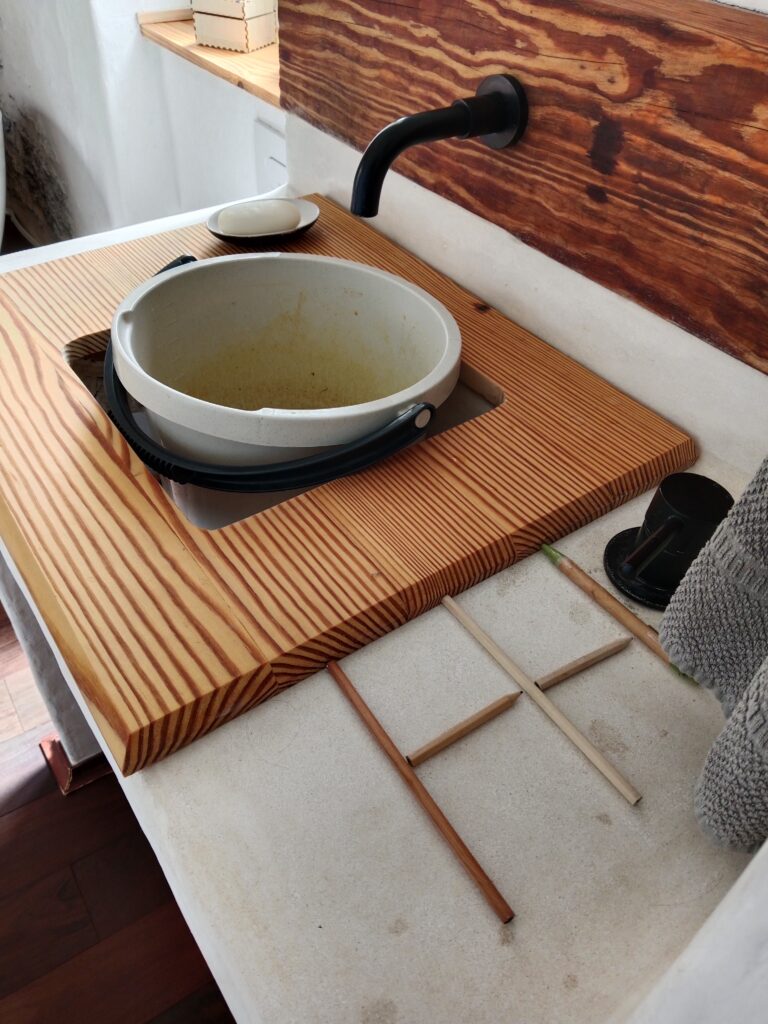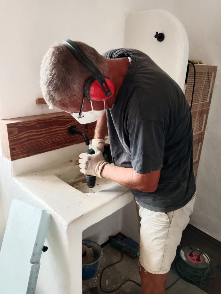 Nun, es war leider nicht lange schön, vermutlich, da wir, wie auch bei der Bank im kleinen Patio, zu vorschnell waren und nicht lange genug gewartet haben, bis der Tadelakt gut getrocknet war. Das zumindest nehme ich an. Und so hatte ich ja schon zwischendurch versucht, den Pfusch mit Microzement zu reparieren, leider auch hier ohne Erfolg und wieder mit Pfusch. Ich hatte die Oberfläche nicht gut genug geschliffen, was gerade in den Ecken unmöglich war, und so blieben kleine Unregelmäßigkeiten, die sich aber sehr schnell mit Dreck festsetzten. Unser Waschbecken war eine Schande, egal, wie oft man es putzte.