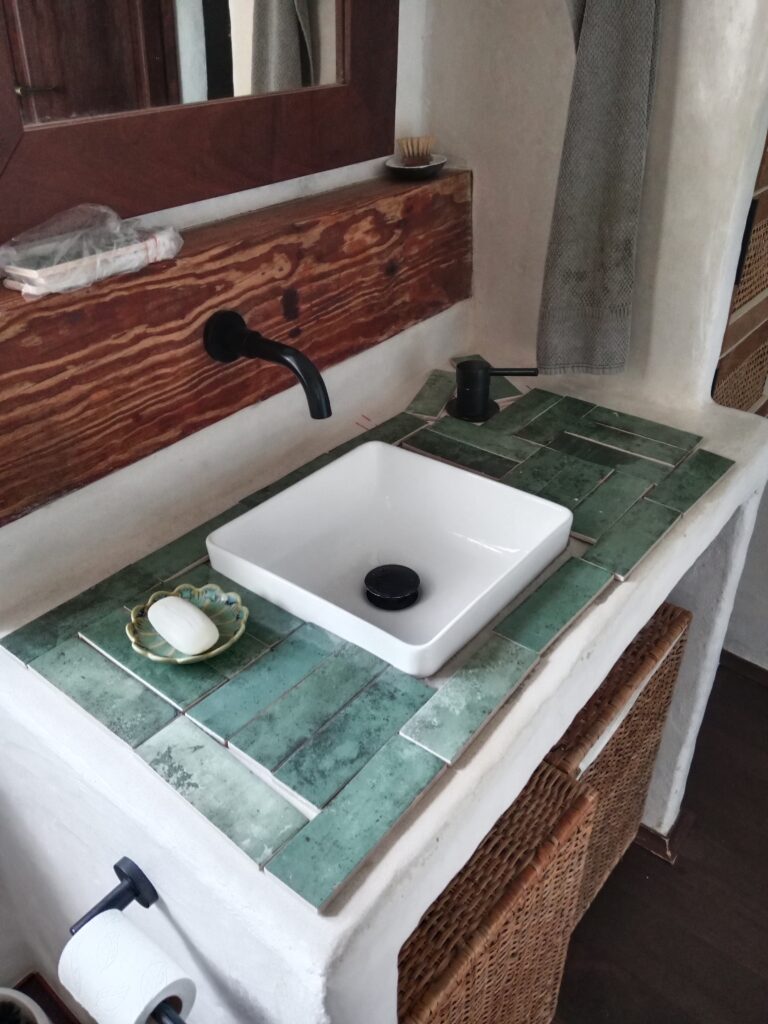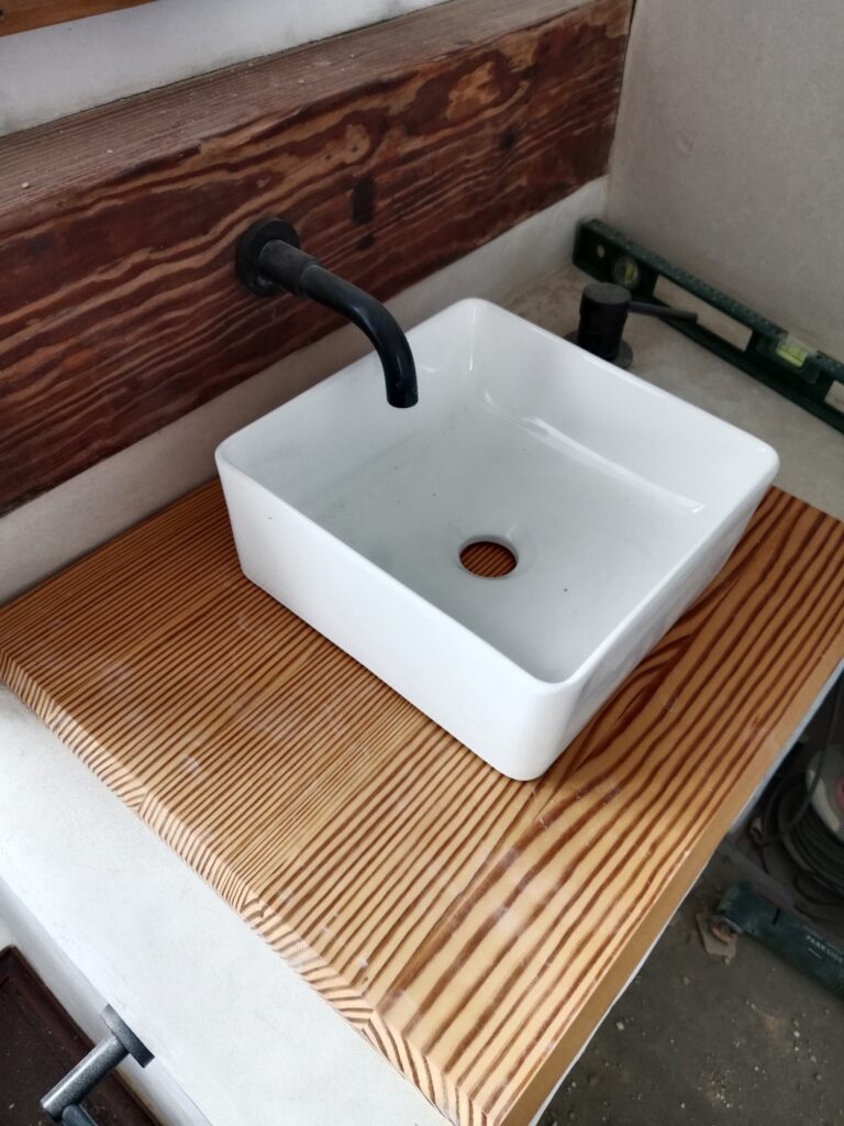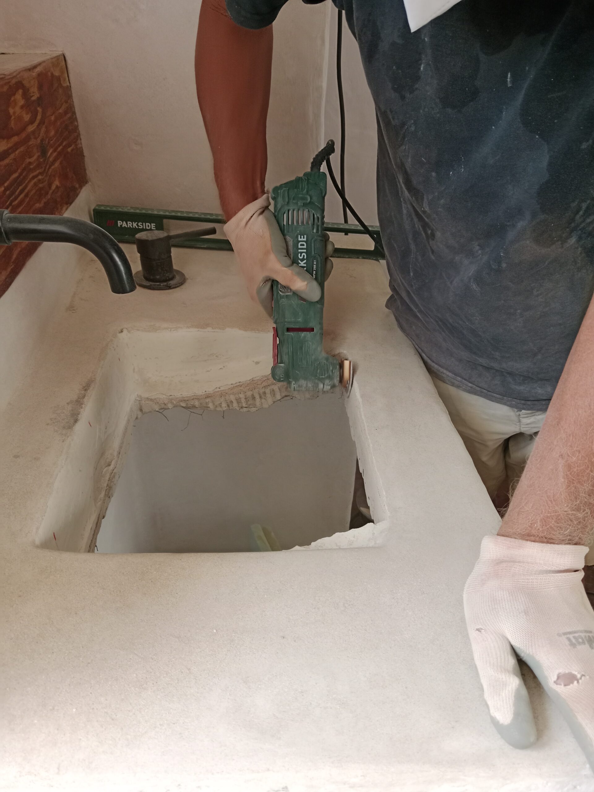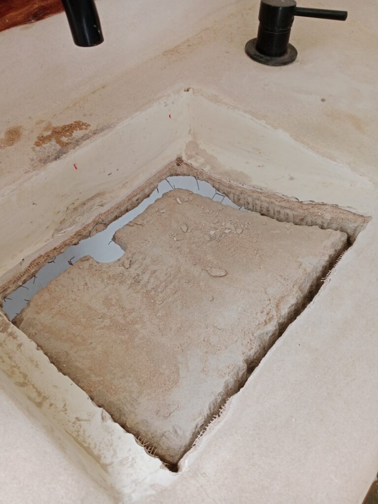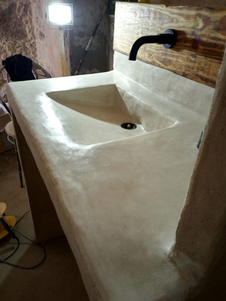 Nun, es war leider nicht lange schön, vermutlich, da wir, wie auch bei der Bank im kleinen Patio, zu vorschnell waren und nicht lange genug gewartet haben, bis der Tadelakt gut getrocknet war. Das zumindest nehme ich an. Und so hatte ich ja schon zwischendurch versucht, den Pfusch mit Microzement zu reparieren, leider auch hier ohne Erfolg und wieder mit Pfusch. Ich hatte die Oberfläche nicht gut genug geschliffen, was gerade in den Ecken unmöglich war, und so blieben kleine Unregelmäßigkeiten, die sich aber sehr schnell mit Dreck festsetzten. Unser Waschbecken war eine Schande, egal, wie oft man es putzte.